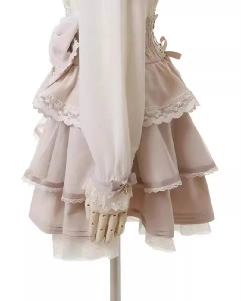 Beige Jirai Kei-kjol med rosett och spetsdetaljer