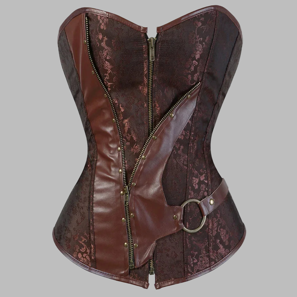 Brun steampunkkorsett i brokad med dragkedja och ringbälte