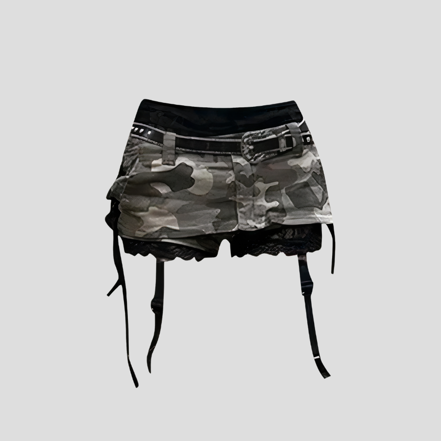 Damshorts i punkstil med kamouflagemönster, spets och bälte
