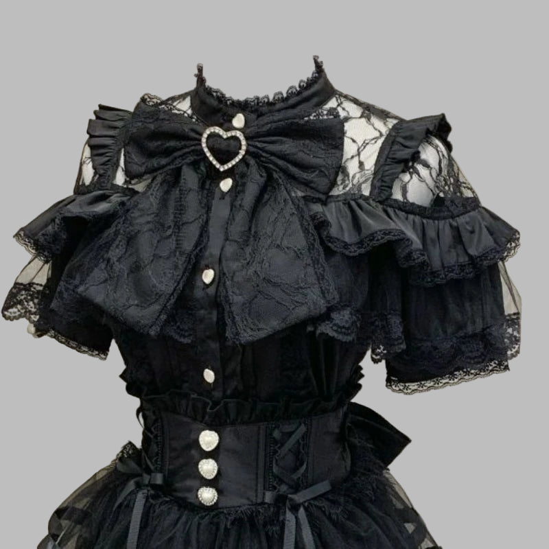 Gotisk Svart Spetsblus med Rosett och Korsettbälte