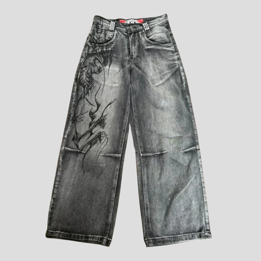 Breda Grunge Jeans med Blommönster Grå