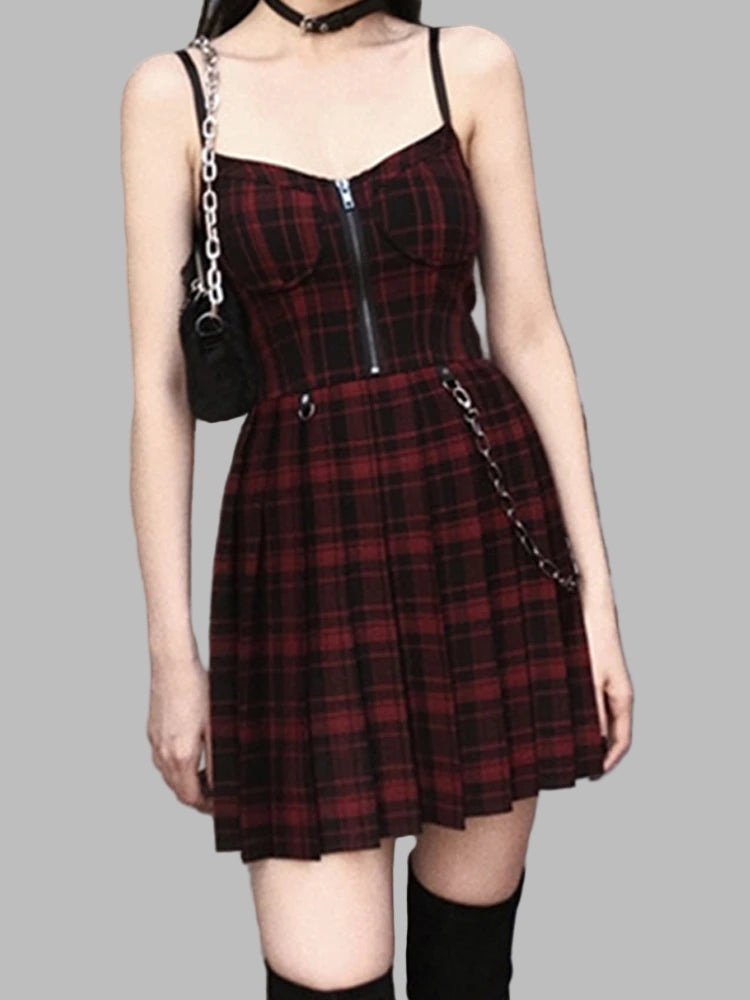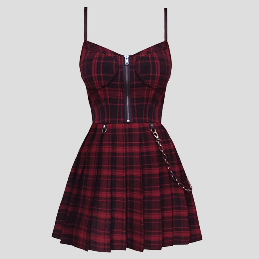 Grunge Punk Klänning Vinröd Rutig med Kedja