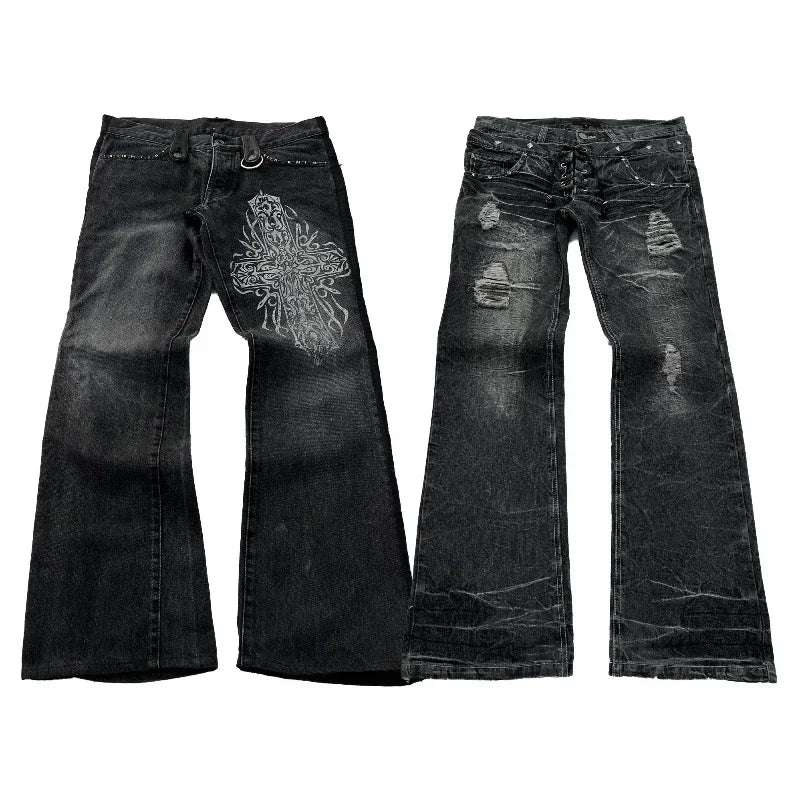 Grunge Utsvängda Jeans med Slitningar och Gotiska Broderier