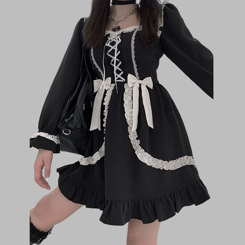Jirai Kei klänning med vita rosetter och snörning svart Visa alternativ