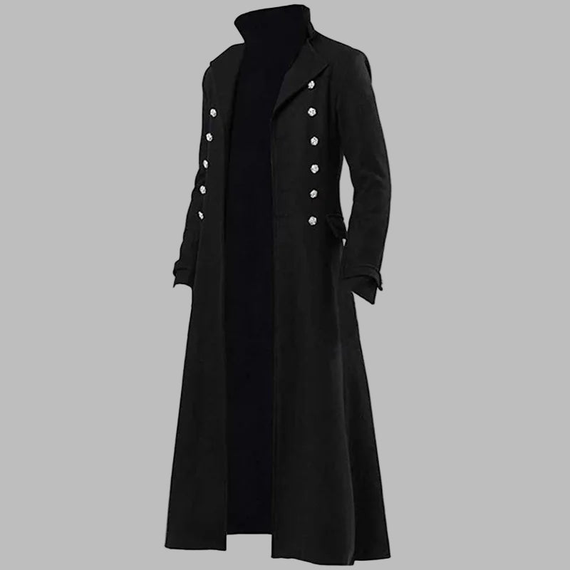 Lång Svart Goth Rock Kappa med Eleganta Metallknappar