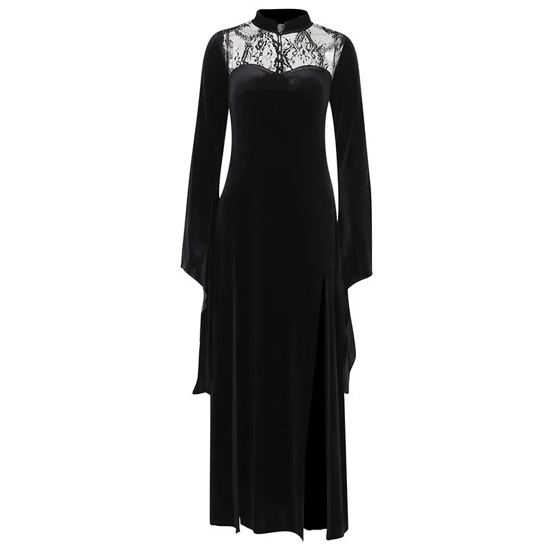 Lång svart gotisk klänning med spets och hög slits
