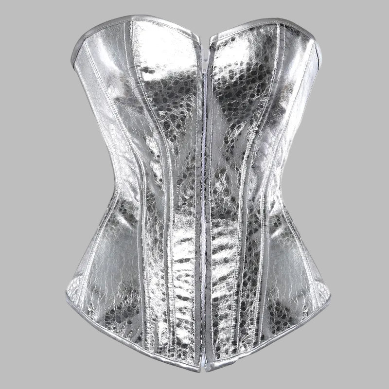 Metallkorsett i silver med ormskinnseffekt och skenor