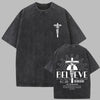 Oversize Grunge T-shirt med Kors och Texten Believe Gotisk