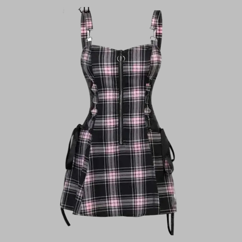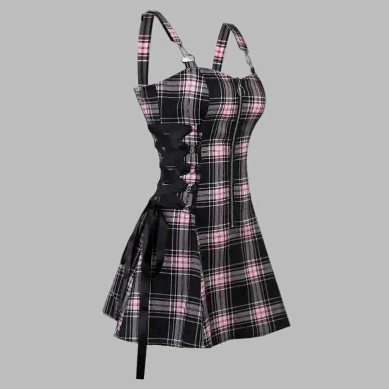 Punk Klänning i Rosa Rutigt med Hängslen och Band