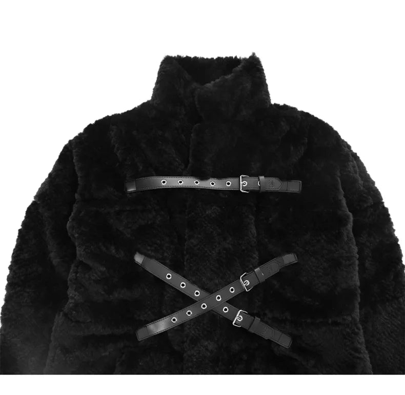 Svart punkrockkappa med bälten och lång pälsdetalj