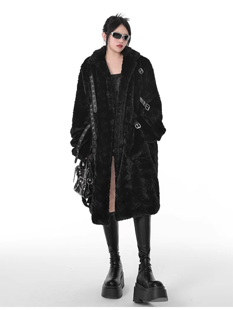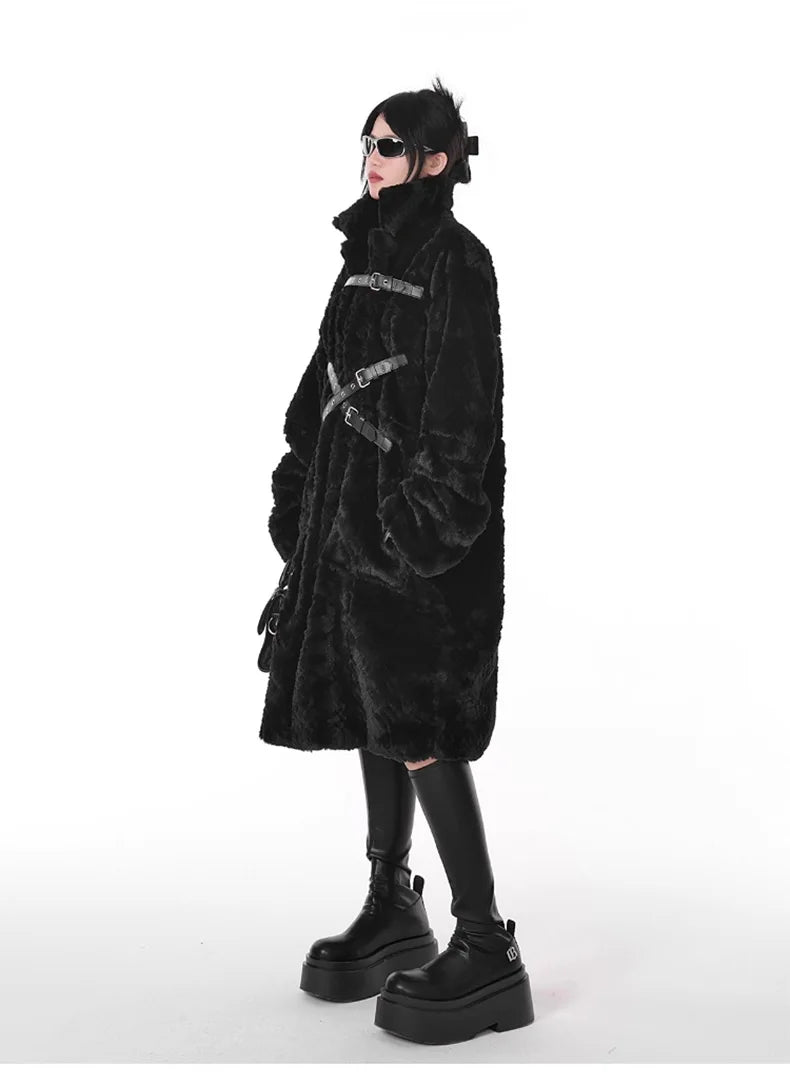 Punk Metal Svart Lång Kappa med Bälten och Pälsdetaljer