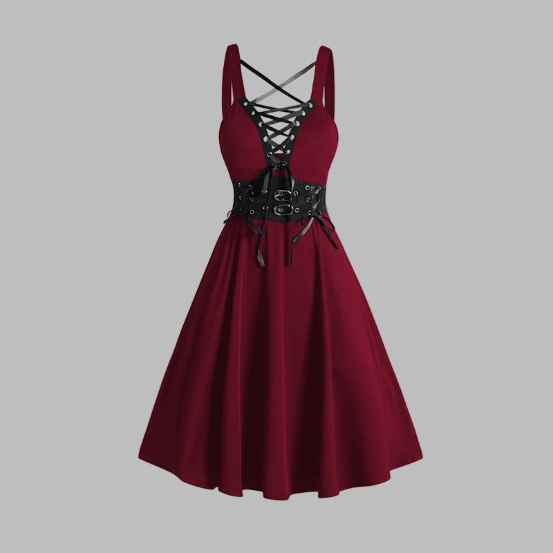 Punk Rock Klänning Vinröd med Korsett och Snörning