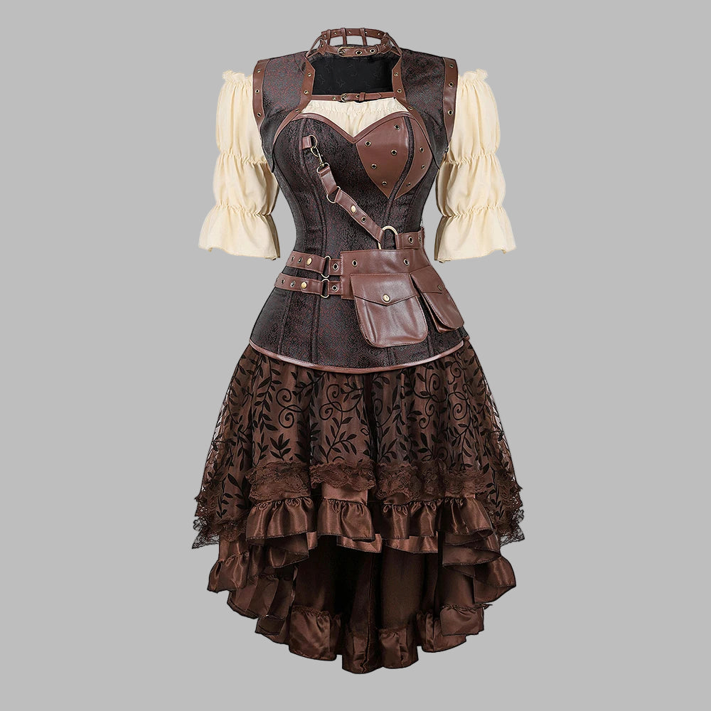 Steampunk Klänning med Korsett, Remmar och Fickor Brun