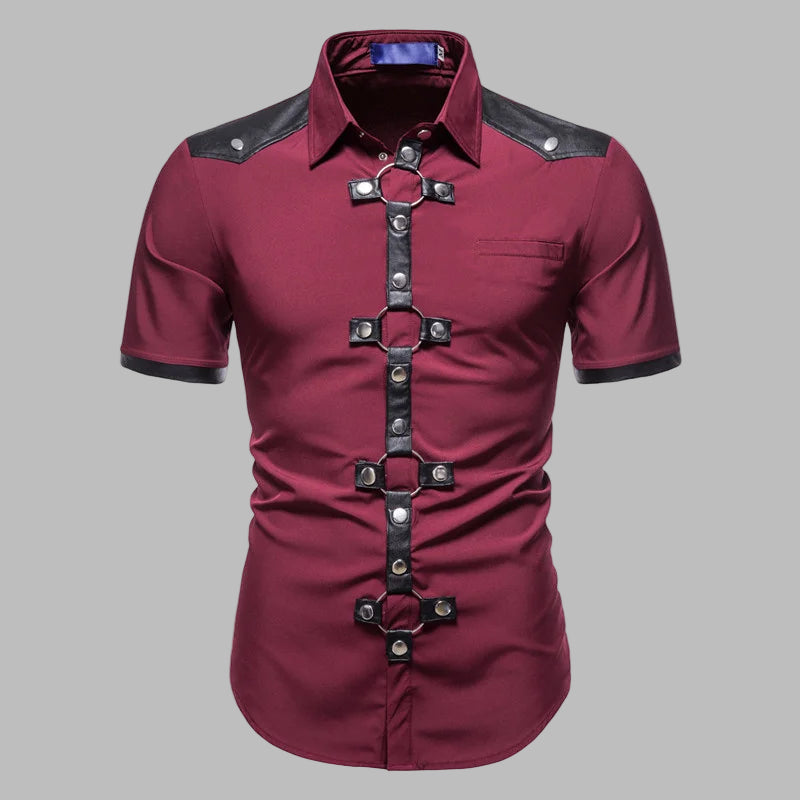 Steampunk Skjorta med Läderremmar Vinröd Kort Ärm