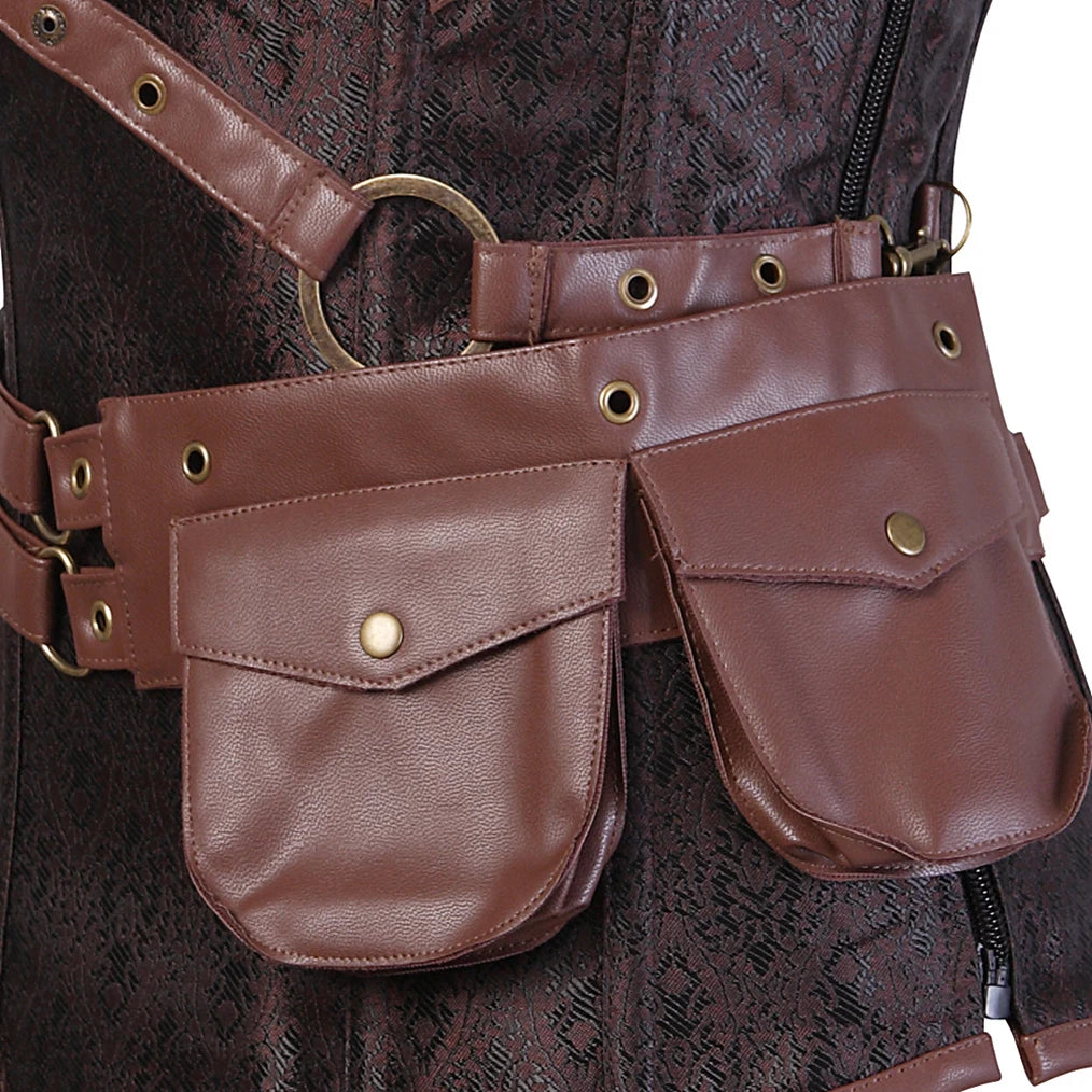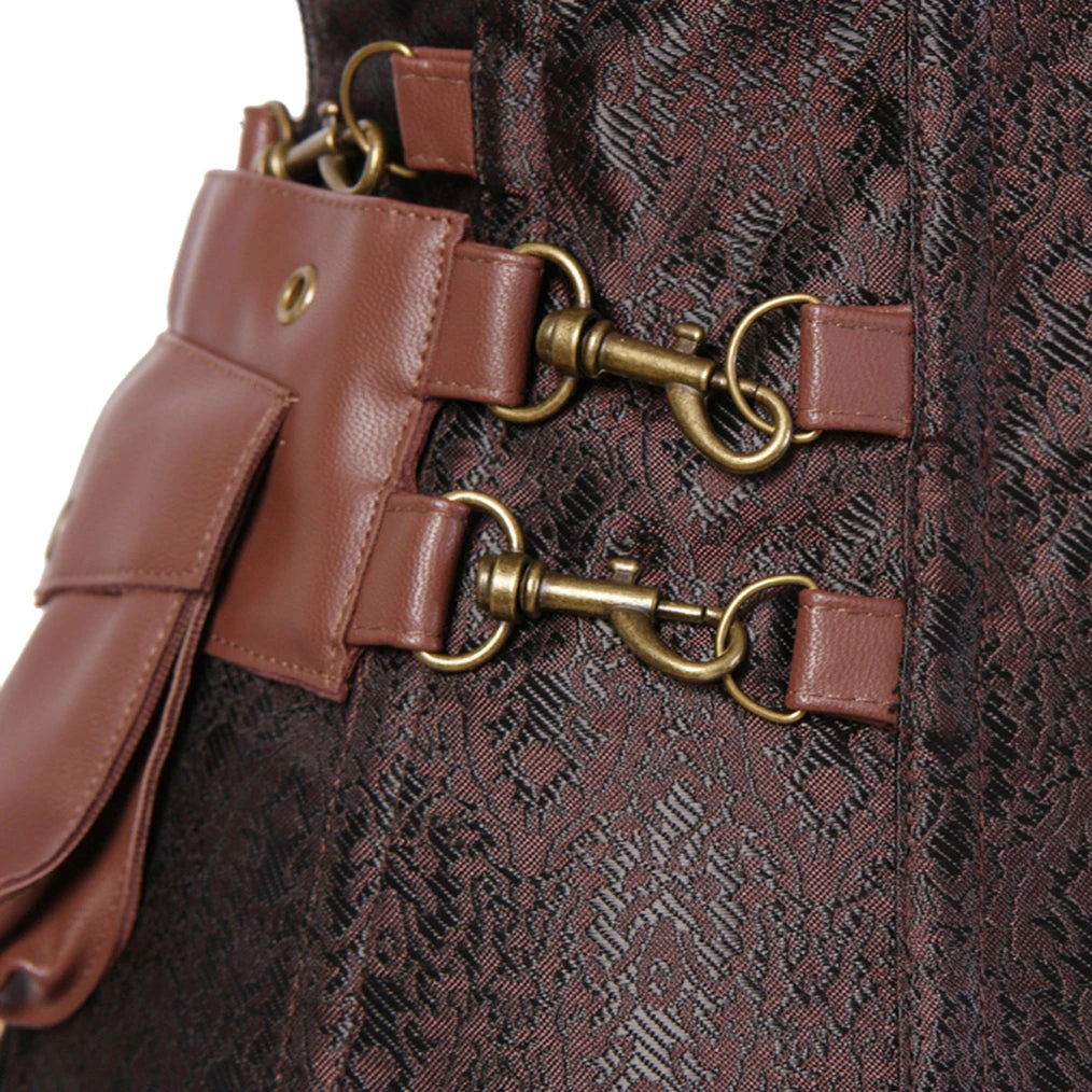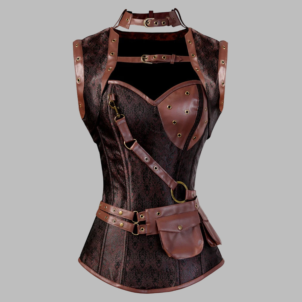 Steampunk-korsett i brunt läder med dekorativa remmar