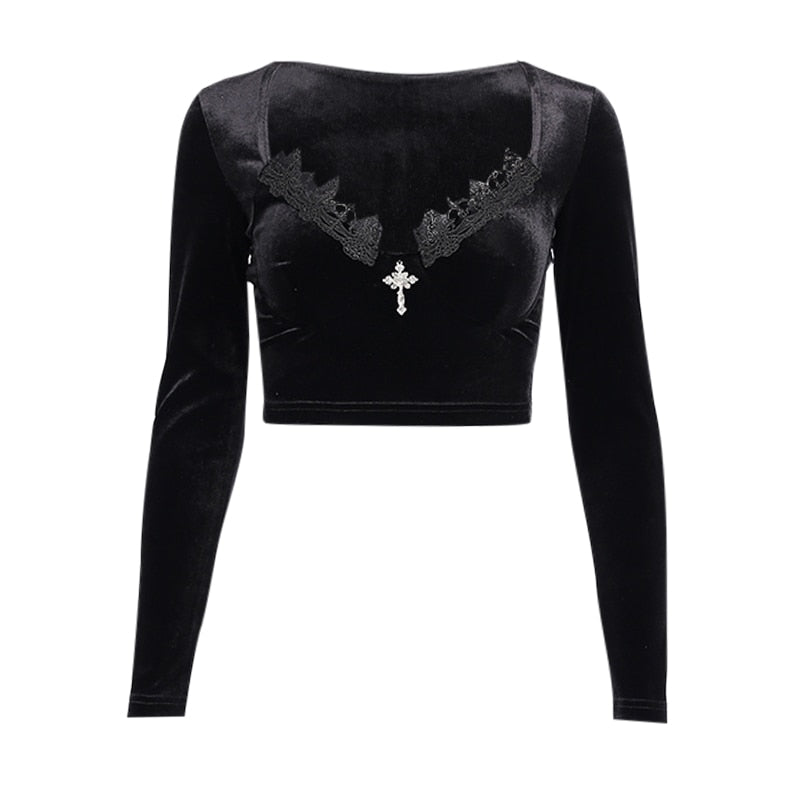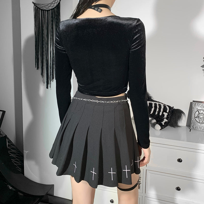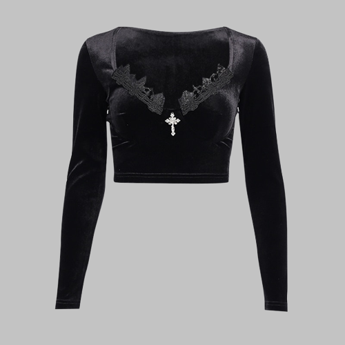 Designad för de djärva, anpassar sig vår Gotiska Topp till dina kurvor och framhäver dem. V-ringningen tillför en touch av mystik, medan snörnings- och rynkdetaljerna ger sensuell elegans. Dess sammetmaterial är lätt elastiskt, vilket garanterar komfort och stil samtidigt som det visar upp din unikhet.