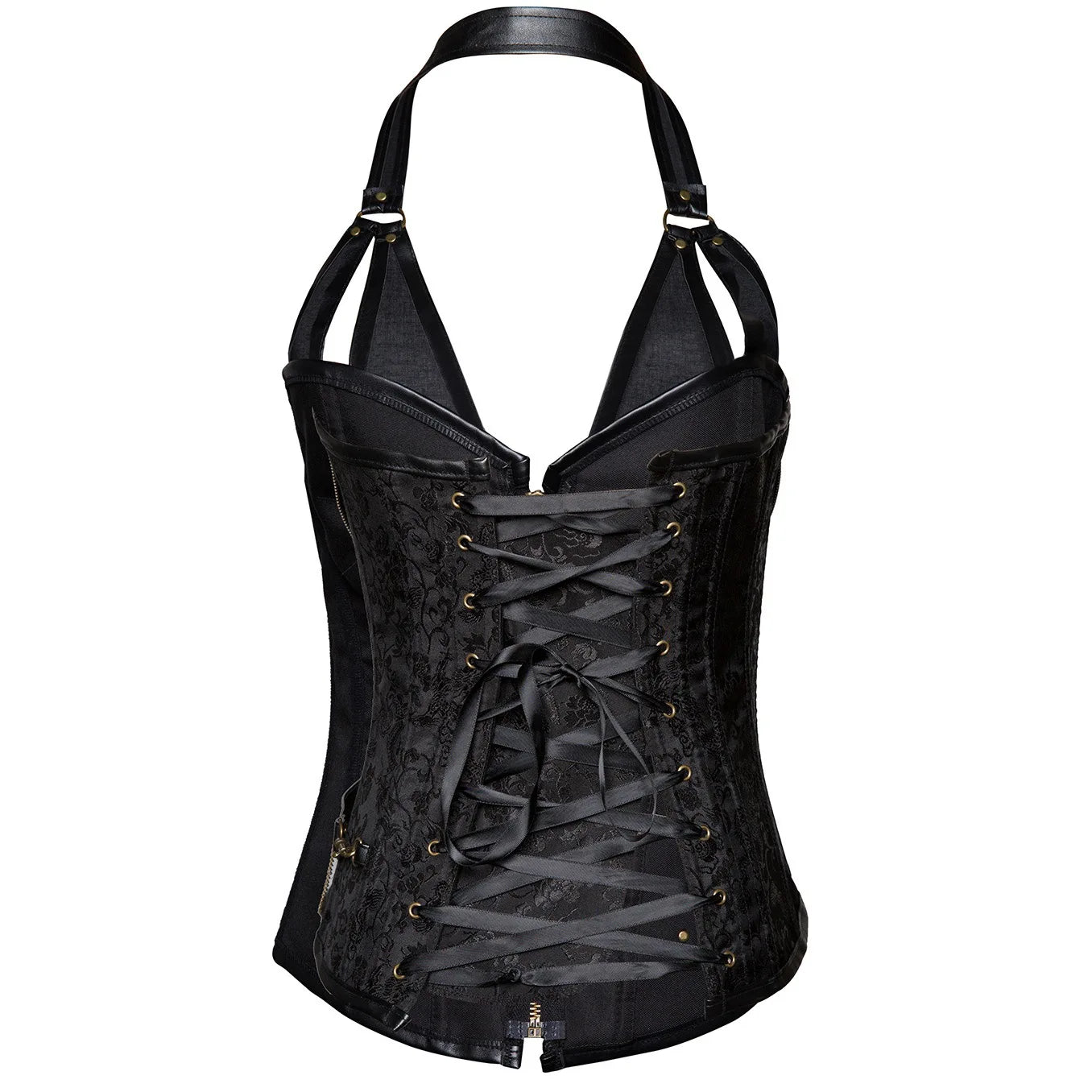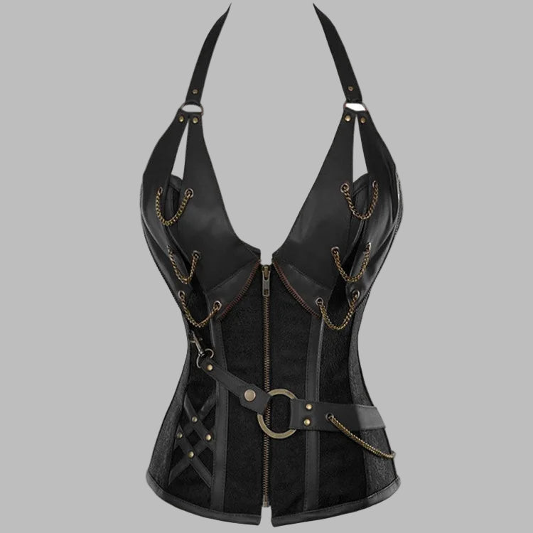 Svart gotisk punkkorsett med kedjor och läderdetaljer