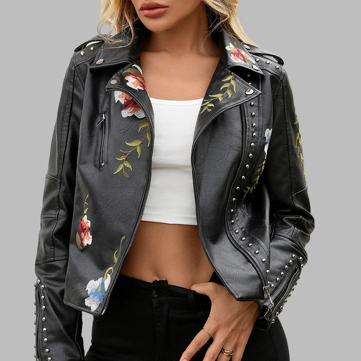 Svart Gotisk Skinnjacka med Nitar och Blombroderi för Kvinnor