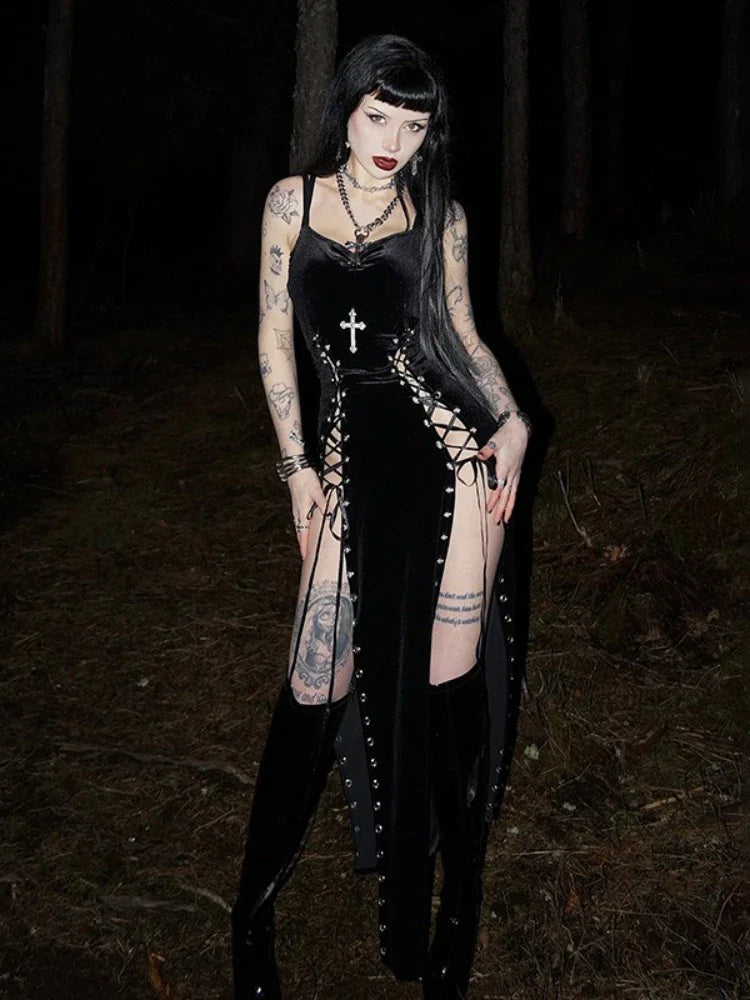 Svart klänning med slits i grunge punk-stil med kors och nät