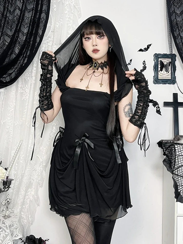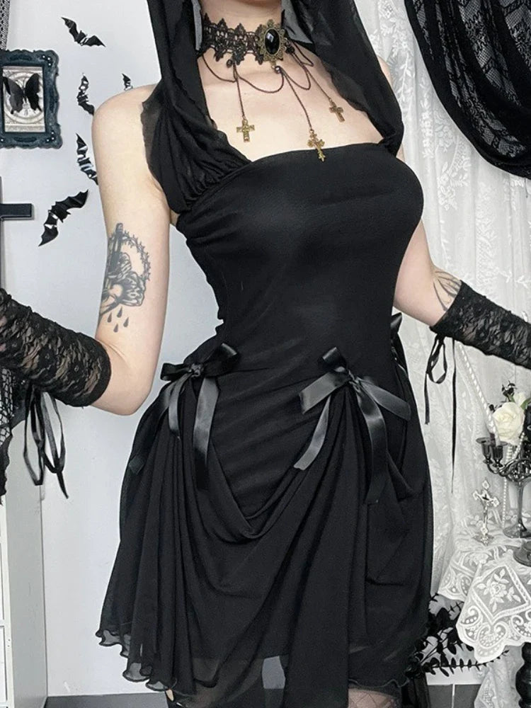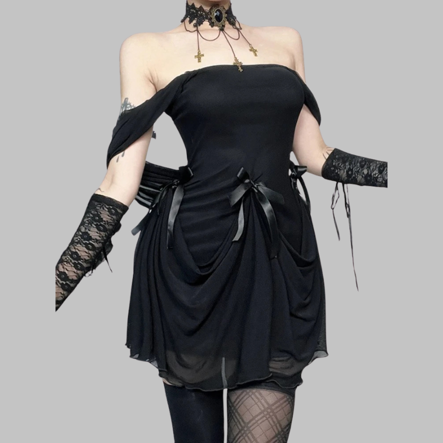 Svart grungeklänning med långa ärmar och draperad kjol Visa alternativ