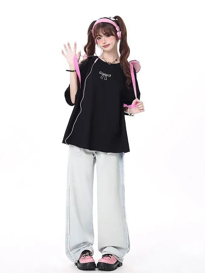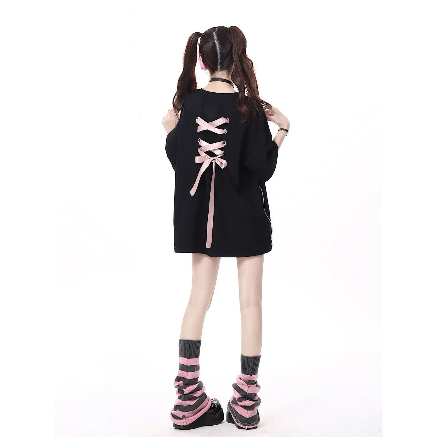 Svart Jirai Kei-tröja med snörning och rosa band på ryggen