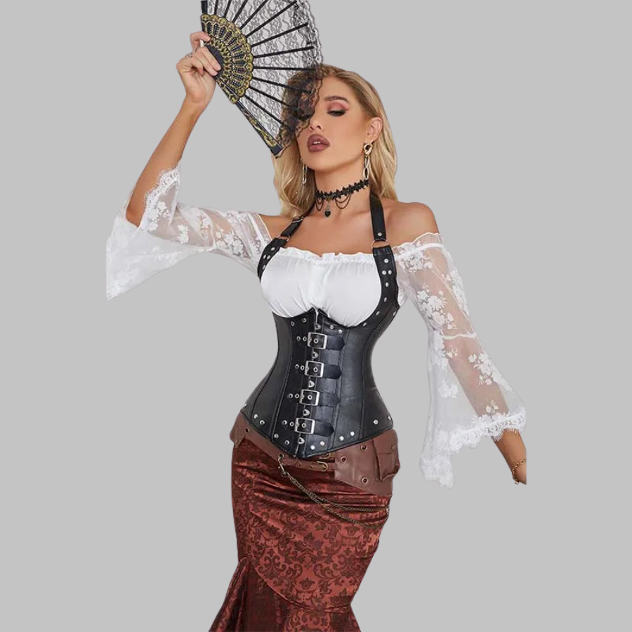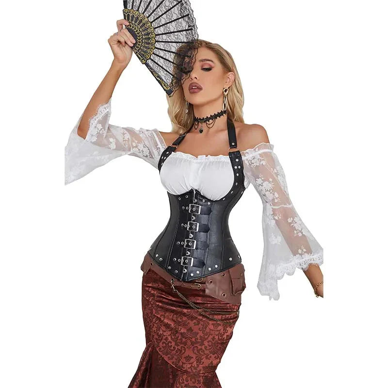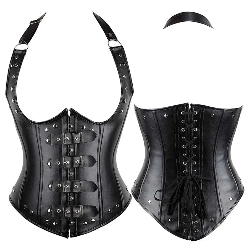 Svart Korsett i Läderimitation för Kvinnor – Gotisk Viktoriansk Stil