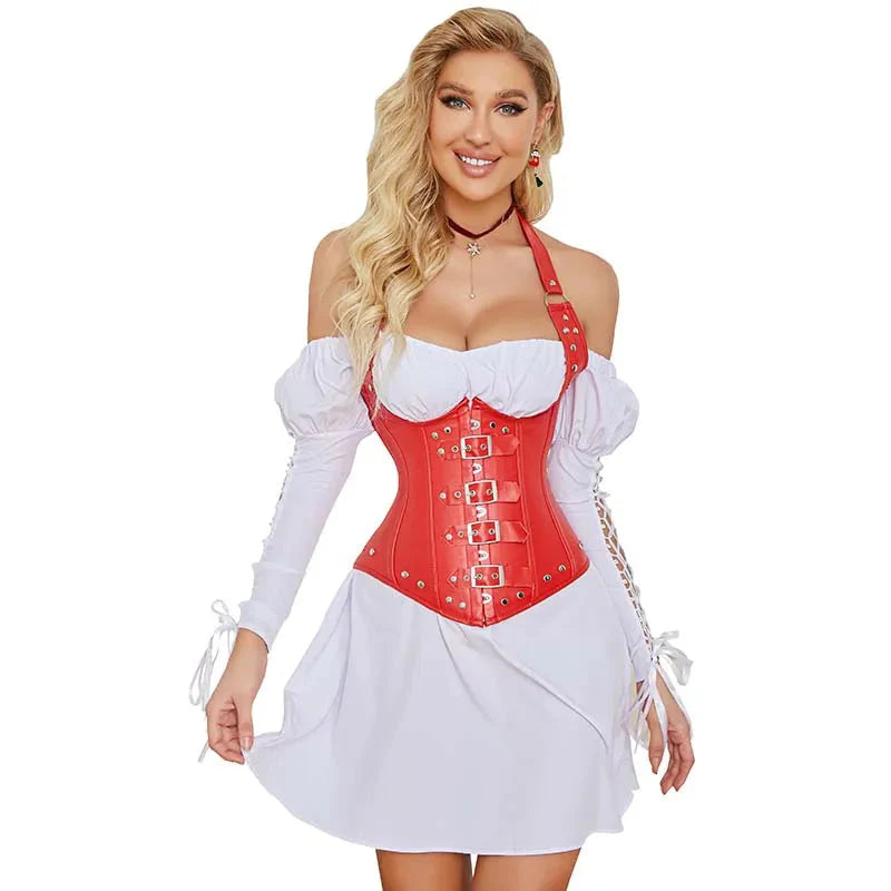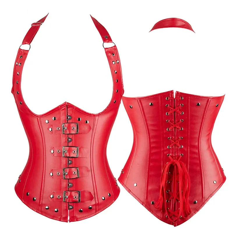 Damkorsett i svart läderimitation – gotisk viktoriansk stil röd