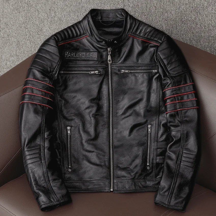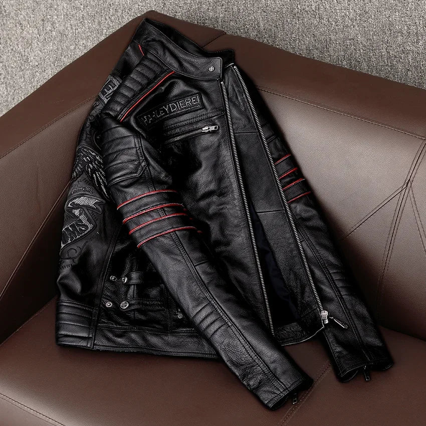 Satsa på en djärv stil med denna herrjacka i äkta läder, dekorerad med broderier och dödskallemotiv. Designad för resor, stadsutflykter och motorcykelentusiaster, kombinerar den hållbarhet, komfort och en unik karaktär. Perfekt för mellansäsongen.