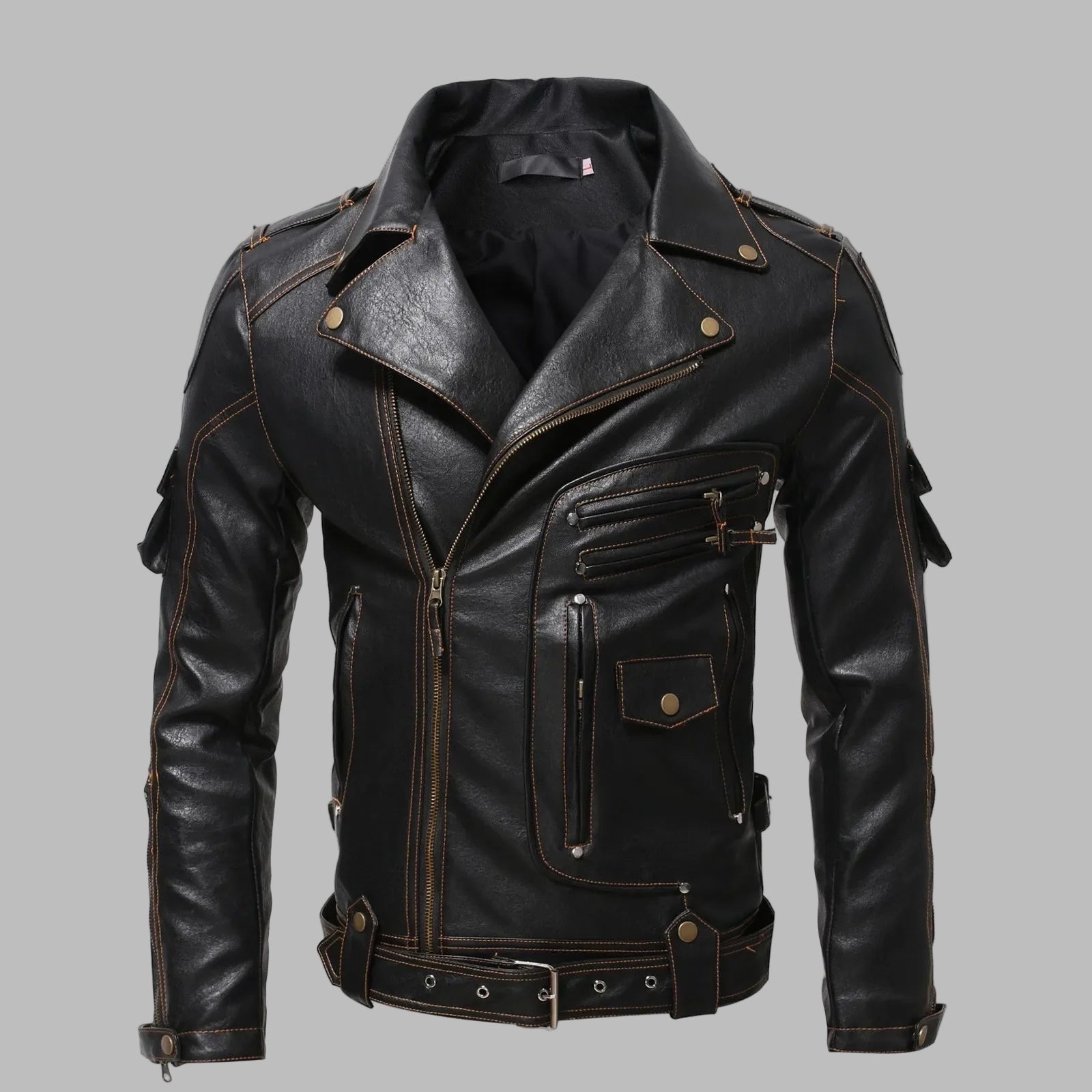 Svart läderjacka herr goth punk med nitar och remmar motorcykelstil