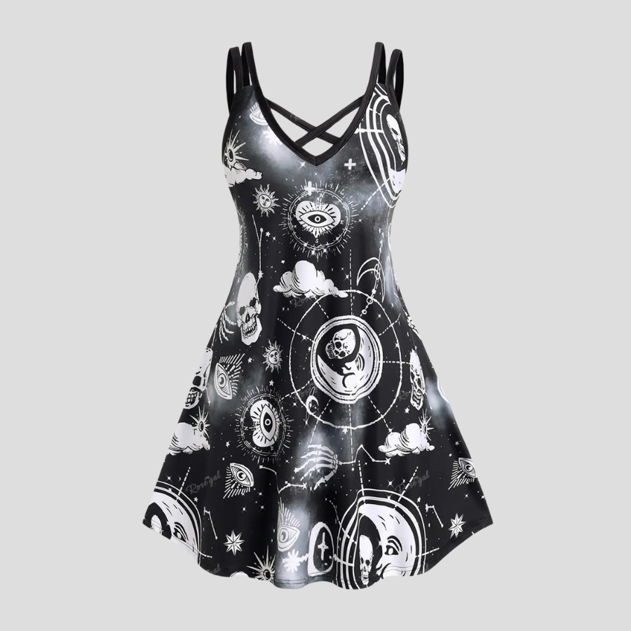 Czarna Sukienka Punk Rock z Symbolami Okultystycznymi i Gwiazdami