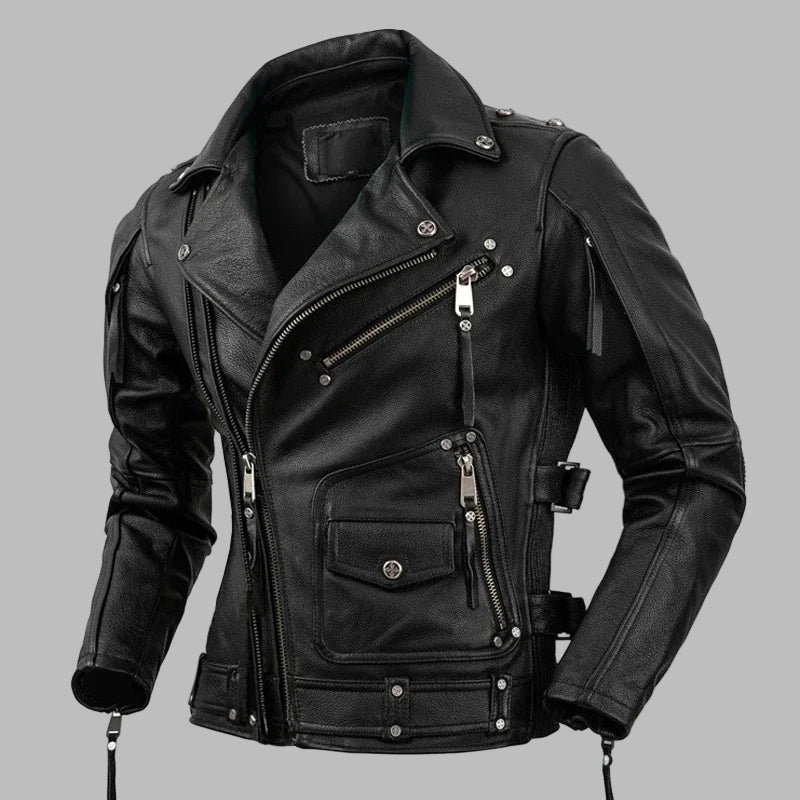 Svart skinnjacka i punkrockstil, ramonesmodell, storlek 8XL