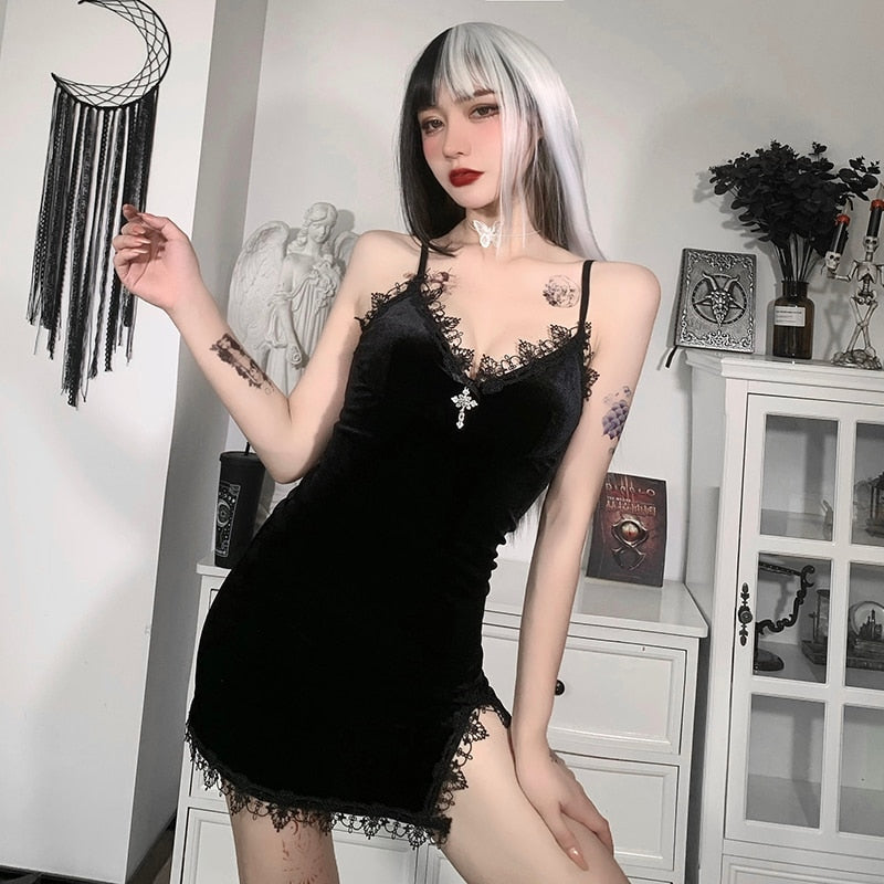 • Dekorationer: svarta spetsar som framhäver plagget, metallkors