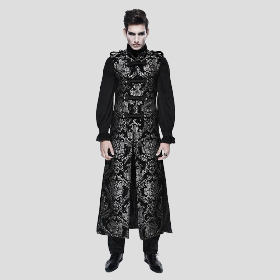 Svart Steampunk Goth-kappa med brokadmönster och remmar