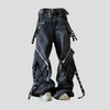 Svarta cargo-byxor med dragkedjor, remmar och fickor herr punk techwear