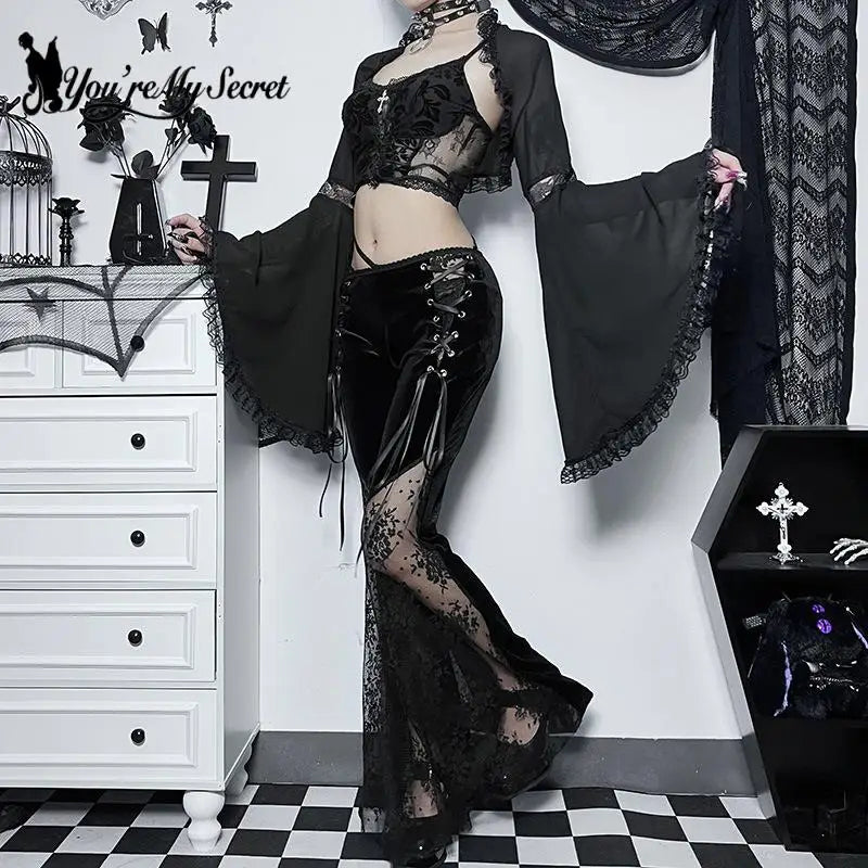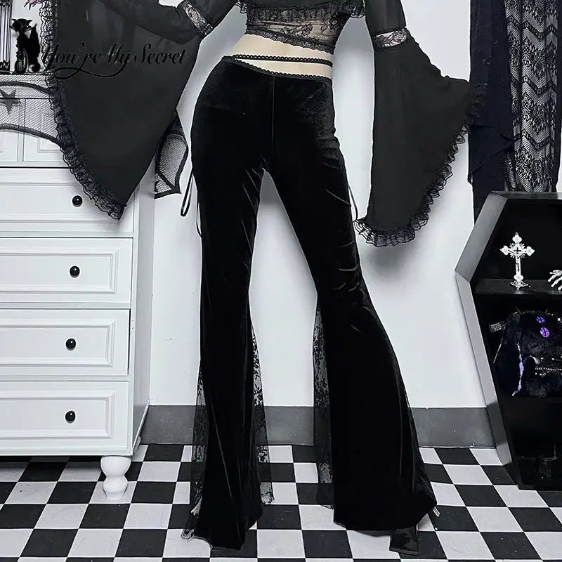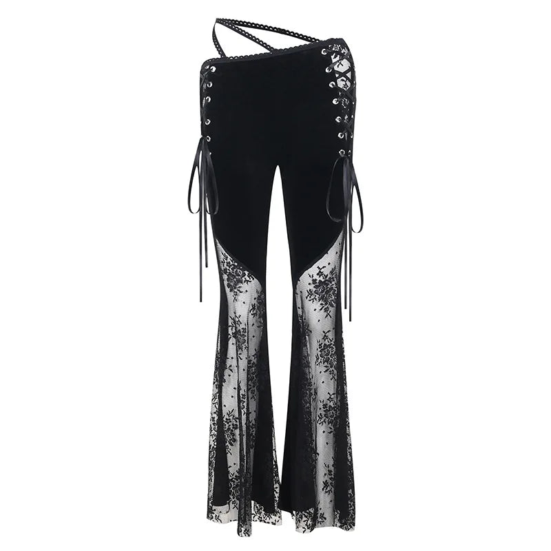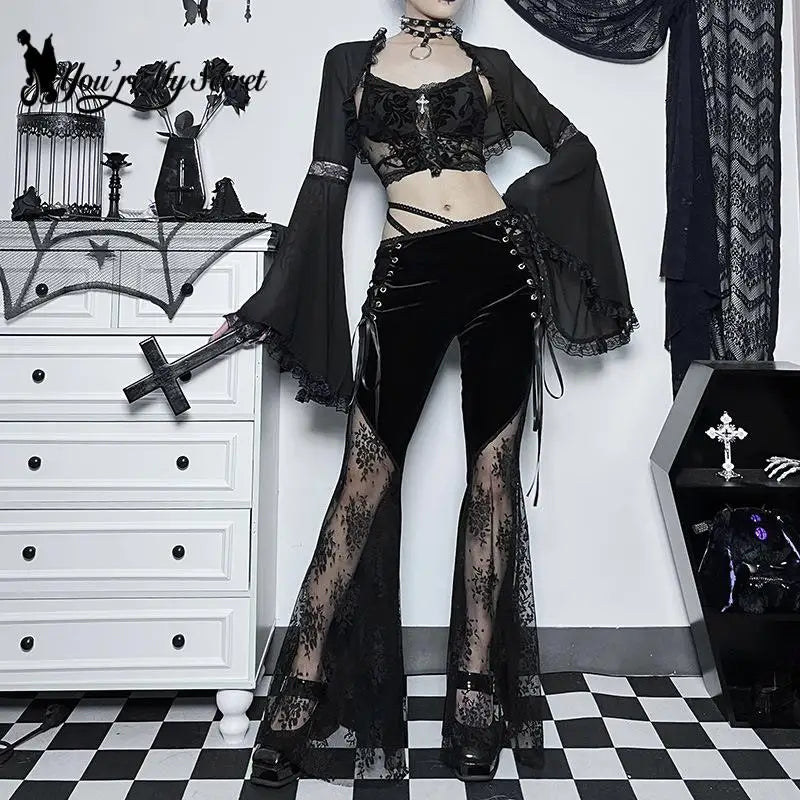 Svarta gotiska byxor med slitsar och spetsdetaljer