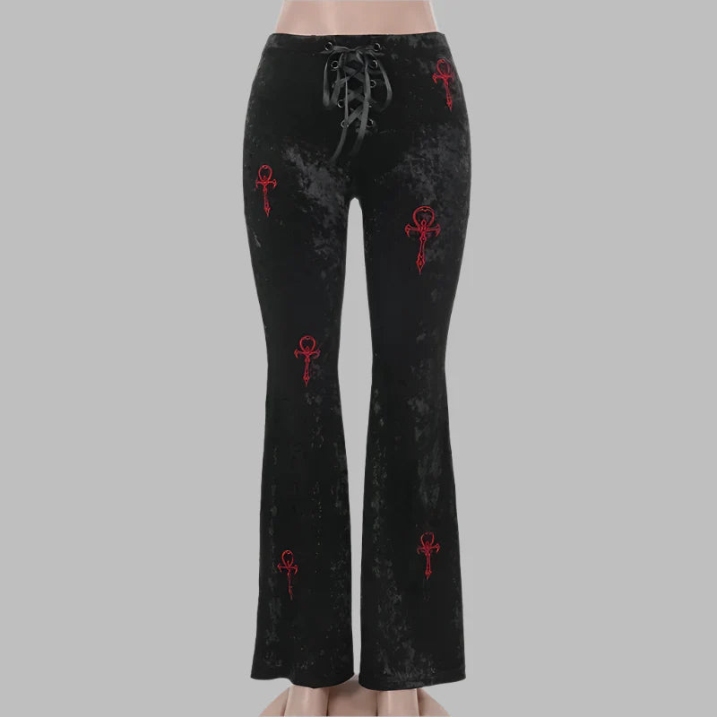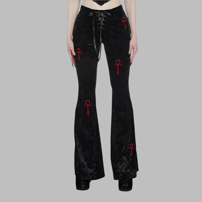 Svarta gotiska sammetsbyxor med hög midja och röda broderade kors