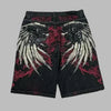 Svarta Grunge Metal Shorts med Vingar och Vinröda Mönster