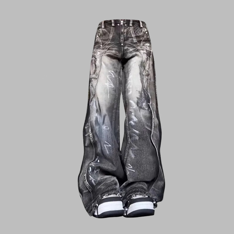 Svarta oversize jeansbyxor med grunge-tryck, unisex, breda