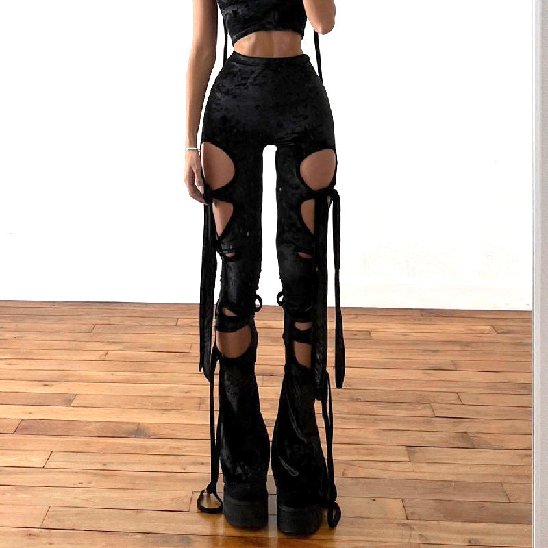 • Unika Detaljer: Detaljer som "Hollow Out," vintage och bandage tillför en konstnärlig dimension till dessa gotiska byxor. Dessa element skapar en visuellt fängslande estetik samtidigt som de framhäver byxornas mörka karaktär.