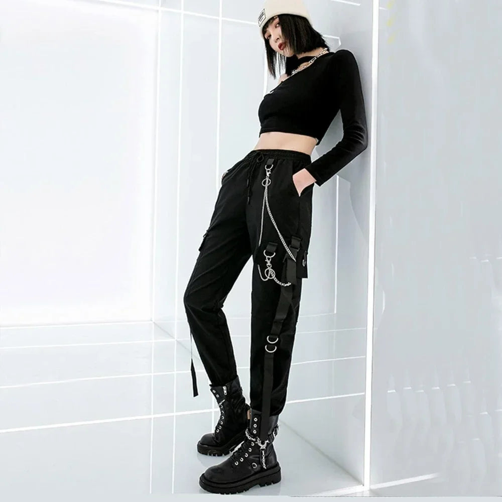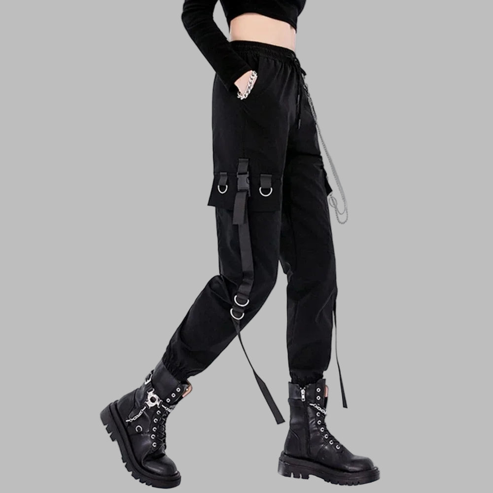 Svarta punkbyxor med metallringar och taktiska remmar Visa alternativ