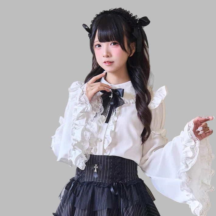 Vit Gotisk Blus med Svart Spets och Rosett Jirai Kei Lolita