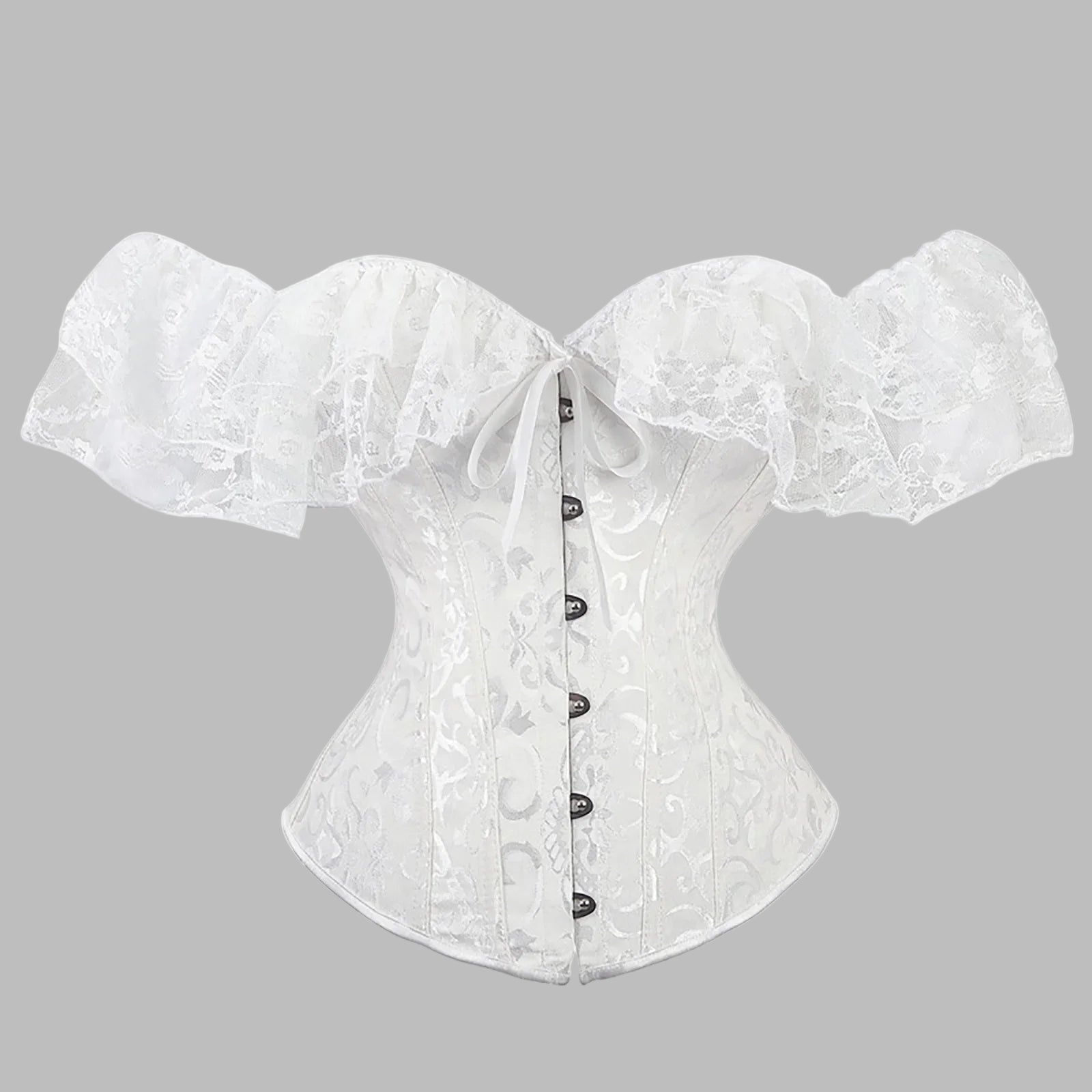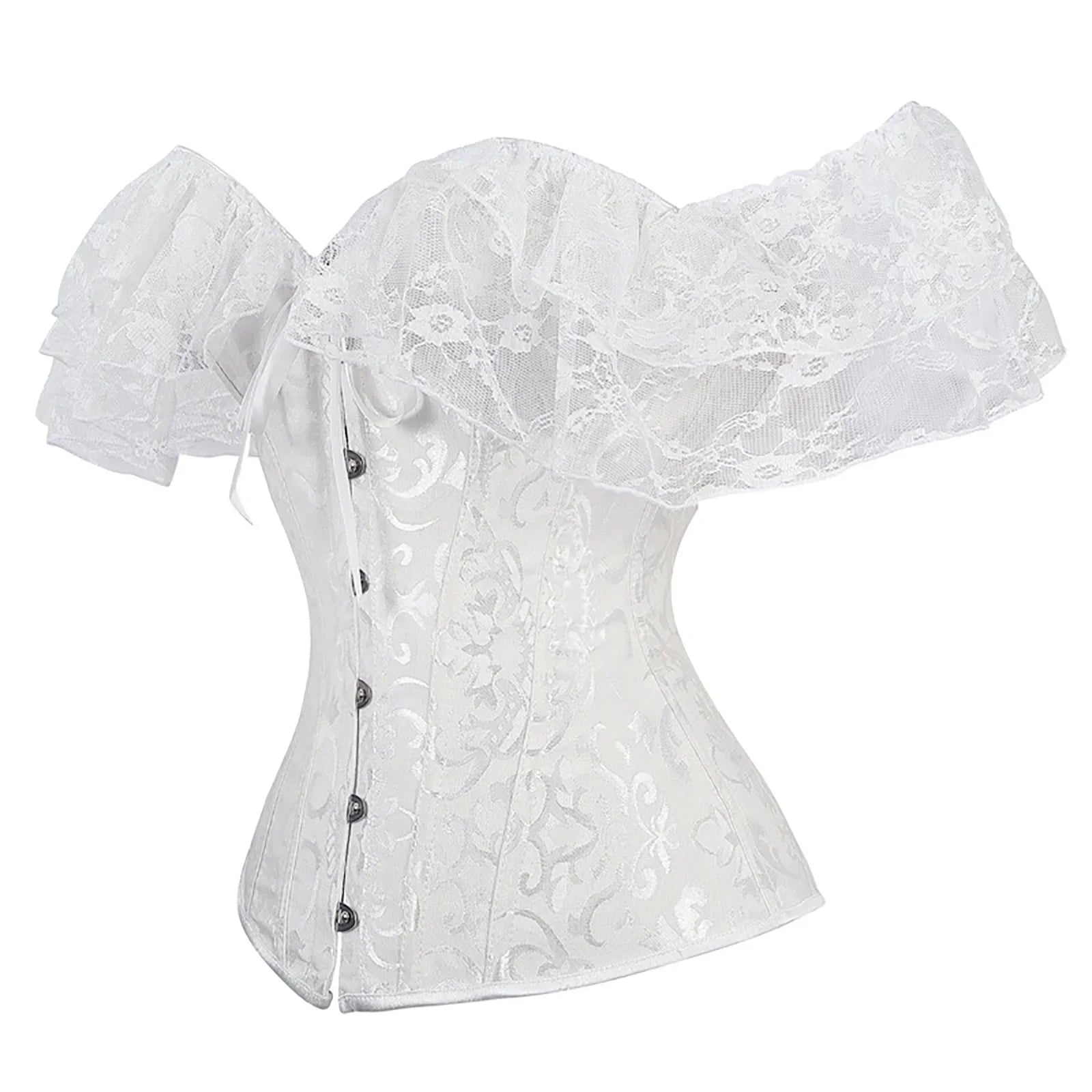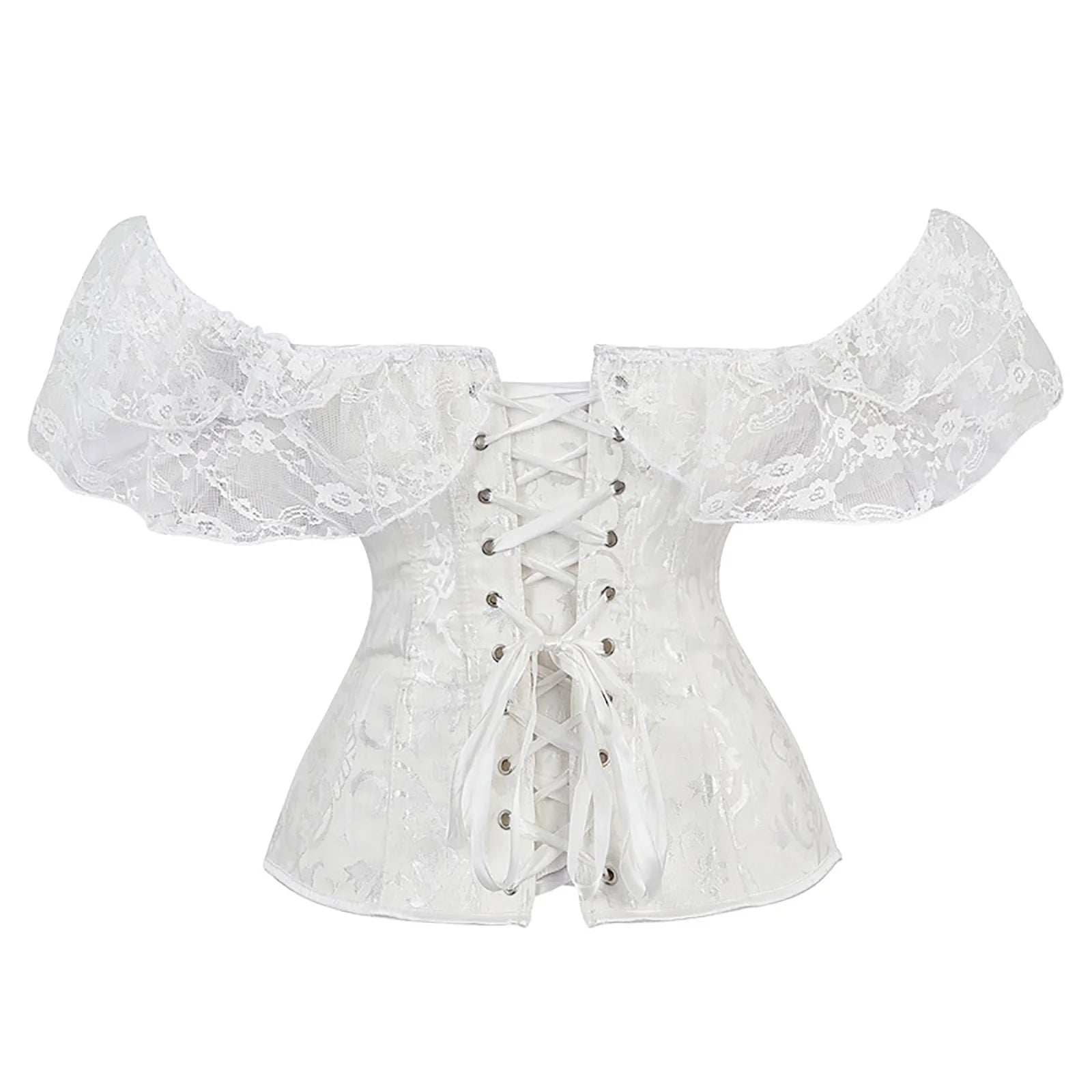 Steampunk Korsett Vit Spets med Puffärmar och Metallhakar XXL
